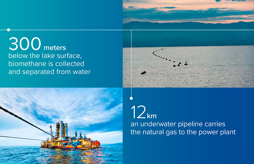 Lake Kivu holds a powerful secret: vast reserves of naturally-produced biomethane. For centuries, this gas has accumulated at the lake’s bottom, fed by the settling of organic material to the bottom of the lake and transformed there by volcanic springs, posing a potential environmental and human risk on the flow from the surface and into the atmosphere.